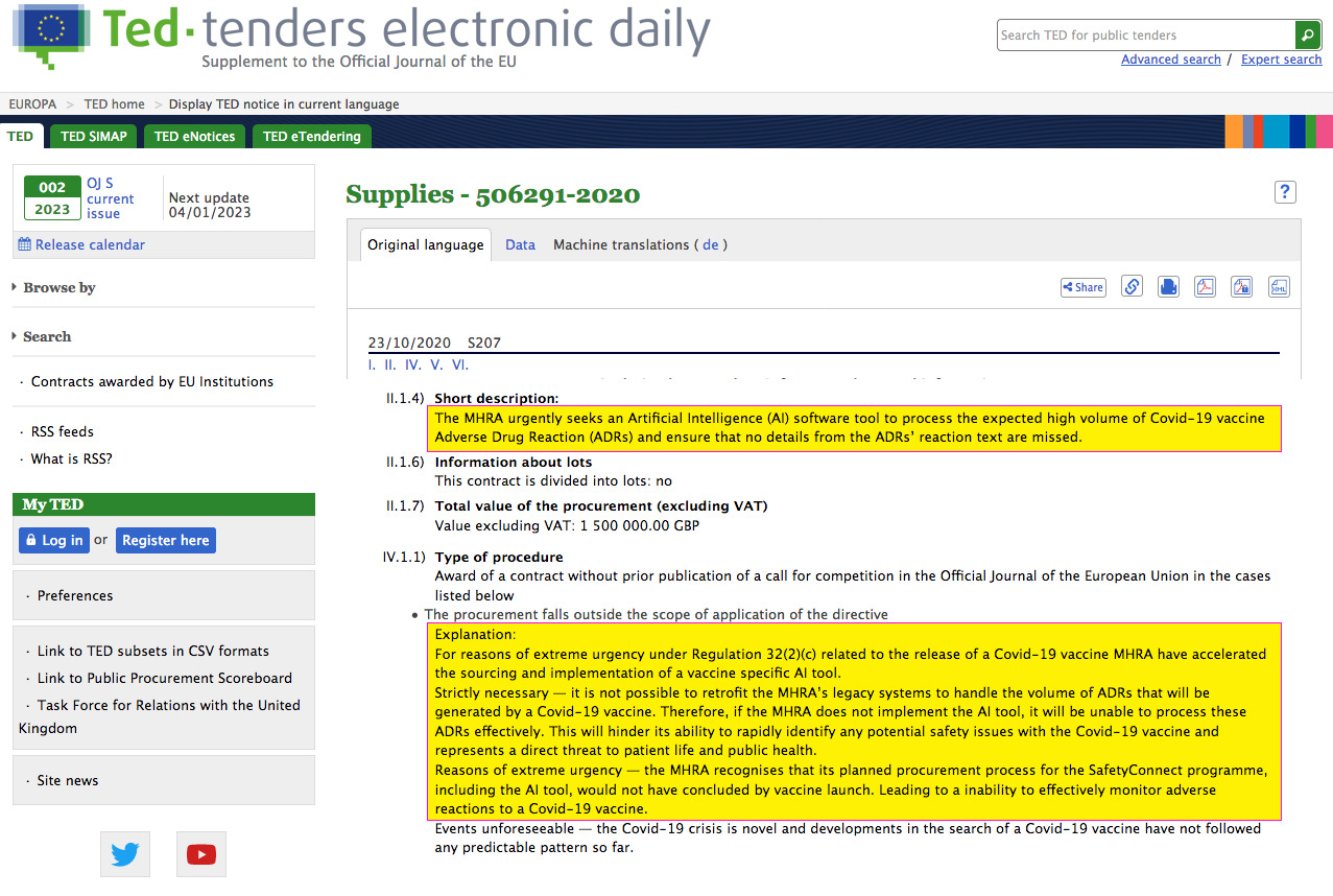 “For reasons of extreme urgency under Regulation 32(2)(c) related to the release of a Covid-19 vaccine MHRA have accelerated the sourcing and implementation of a vaccine specific AI tool. Strictly necessary — it is not possible to retrofit the MHRA’s legacy systems to handle the volume of ADRs that will be generated by a Covid-19 vaccine. Therefore, if the MHRA does not implement the AI tool, it will be unable to process these ADRs effectively. This will hinder its ability to rapidly identify any potential safety issues with the Covid-19 vaccine and represents a direct threat to patient life and public health.”